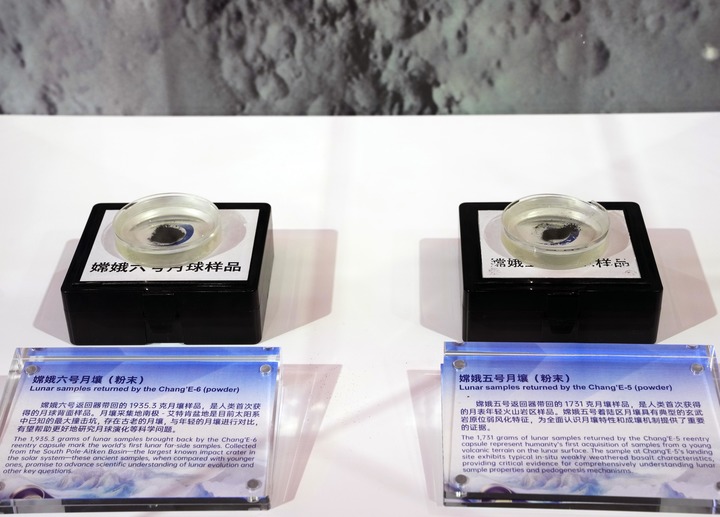 2025年11月5日在第八届进博会国度展中国馆拍摄的“嫦娥五号”月壤和“嫦娥六号”月壤。新华社记者 刘颖 摄