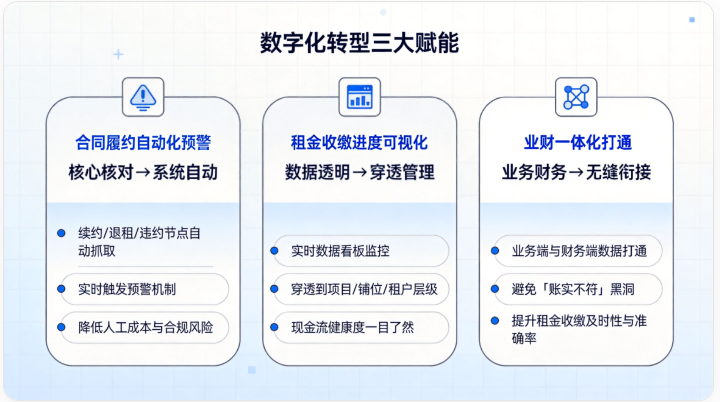 左券践约自动化预警: 夙昔依赖东说念主工查对的续约、退租、爽约等节点,幸运飞艇app下载当今系统自动合手取并触发预警,大幅缩小了东说念主工骚扰资本与合规风险。