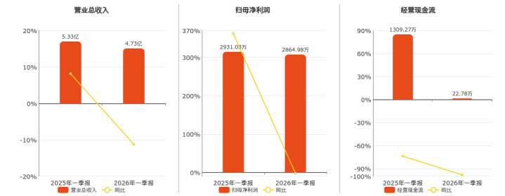 公司贸易总收入为4.73亿元,较旧年同呈报期贸易总收入减少5979.98万元,同比拟旧年同时下落11.23%。归母净利润为2864.98万元,较旧年同呈报期归母净利润减少66.04万元,同比拟旧年同时下落2.25%。观点手脚现款净流入为22.78万元,较旧年同呈报期观点手脚现款净流入减少1286.49万元,同比拟旧年同时下落98.26%。