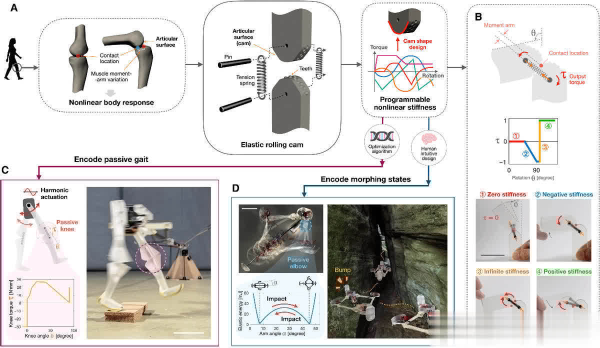 大众好!机械智能,望望科学家们怎么用超可编程关节来编码它,让机器东谈主变得更横暴!在当然界,动物们身段的精妙构造让它们能应答完成多样高难度行为,这背后等于 “具身智能” 在起作用。但对机器东谈主来说,领有像动物相同智能的身段可防碍易,不外目下有了新冲破,那等于弹性更正凸轮(ERC),它就像给机器东谈主身段赋予了神奇魅力。