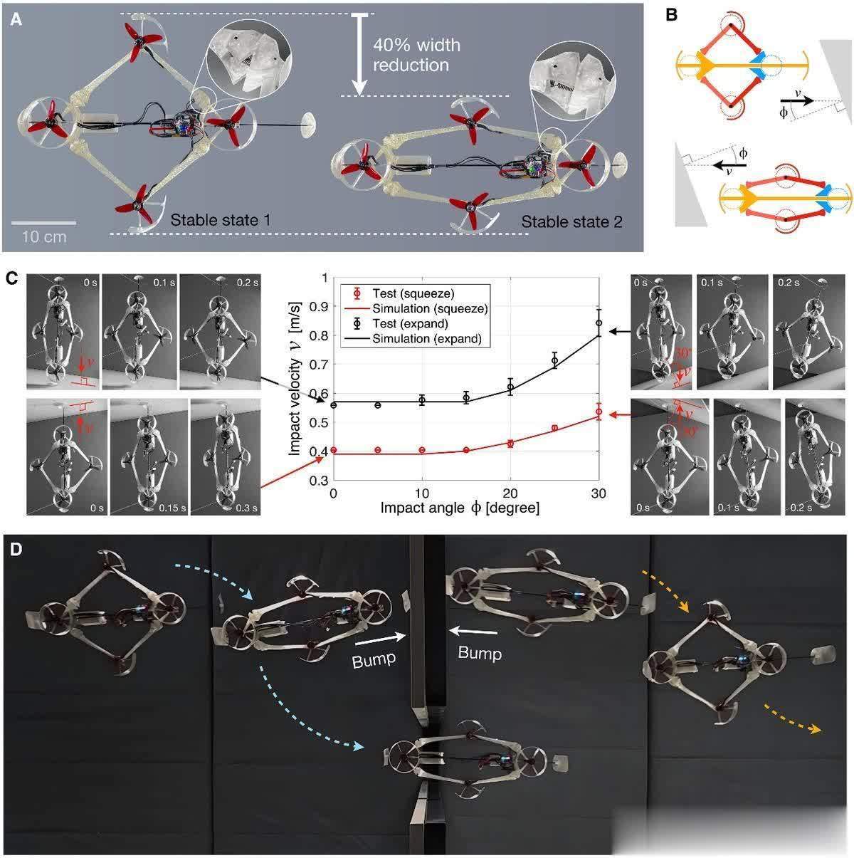{jz:field.toptypename/}除了双足机器东谈主,ERC 在无东谈主机领域也大显神通。连络东谈主员缱绻了一种能被迫双态变形的无东谈主机,环节就在于 ERC 的双稳态肘关节。当无东谈主机受到外部撞击时,它能像变形金刚相同,在法式方形和窄缩步地之间切换。窄缩情状能让无东谈主机应答穿过褊狭通谈,方步地态则能提升飞行恶果。何况,这种变形不需要额外的传感器和扫尾器,齐全依靠 ERC 的神奇特质,是不是超酷?