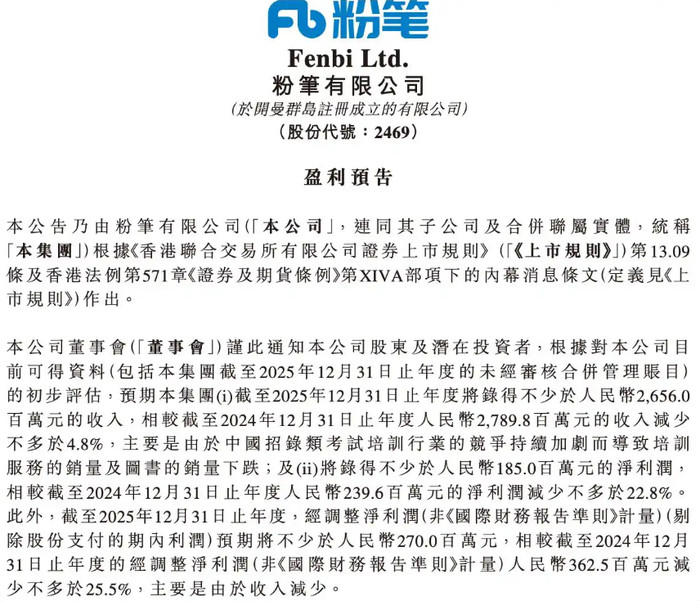 公告自大,粉笔预期2025年度将录得收入不少于东谈主民币26.56亿元,相较2024年度的27.9亿元减少未几于4.8%。净利润展望不少于东谈主民币1.85亿元,较2024年度的2.4亿元减少未几于22.8%。经调理净利润(剔除股份支付影响)展望不少于东谈主民币2.70亿元,较2024年度的3.63亿元减少未几于25.5%。