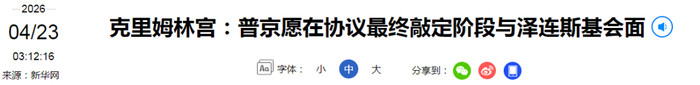 克里姆林宫:普京愿在条约最终敲定阶段与泽连斯基会面