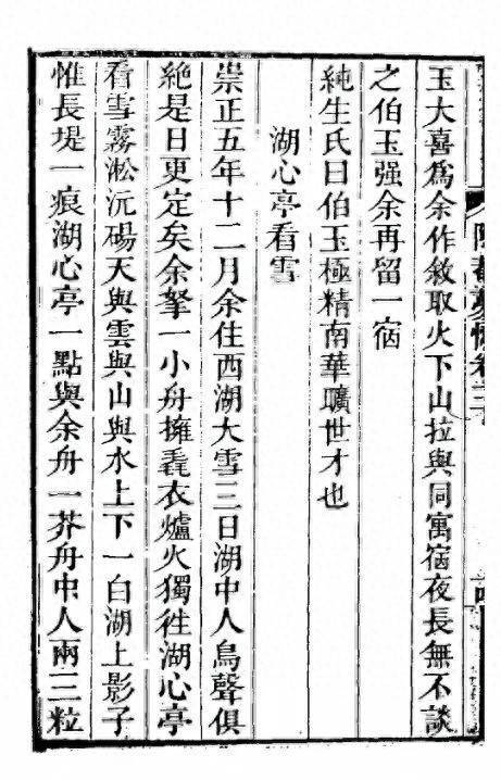 《湖心亭看雪》,乾隆五十九年刻本《陶庵梦忆》,刻本中“崇正”系因护讳清雍正帝名讳胤禛而改“崇祯”年号为“崇正”。鲁迅在《阿Q正传》中以形容未庄东谈主遐想创新党“个个白盔白甲,衣服崇正天子的素”,额外用了清朝护讳字“崇正”而非原字“崇祯”,恰是朝笑这小数。