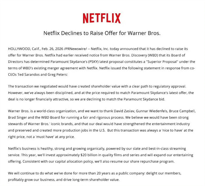 1905电影网专稿 2026年2月26日,好意思国流媒体巨头网飞在官网发布声明,进展通告甩掉对华纳昆季探索公司的收购探讨。